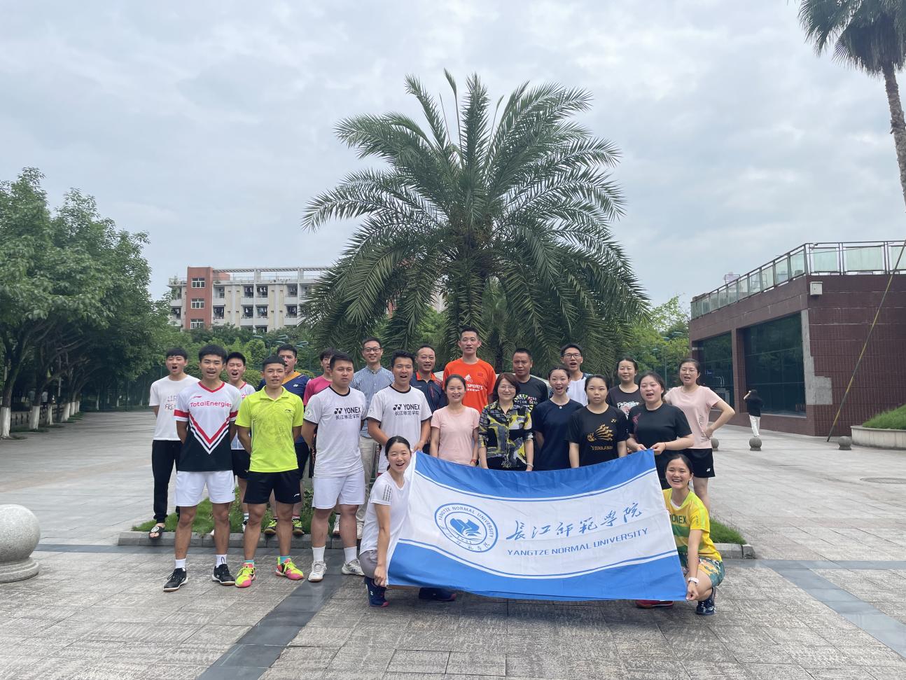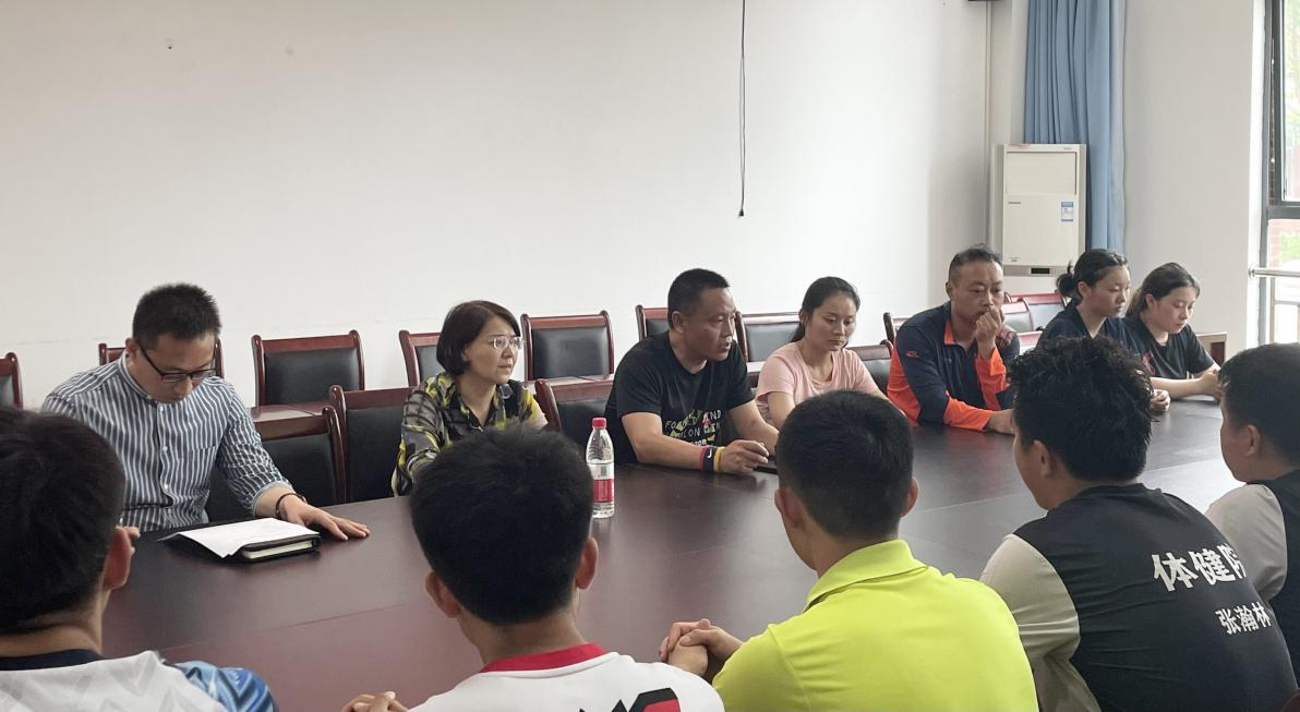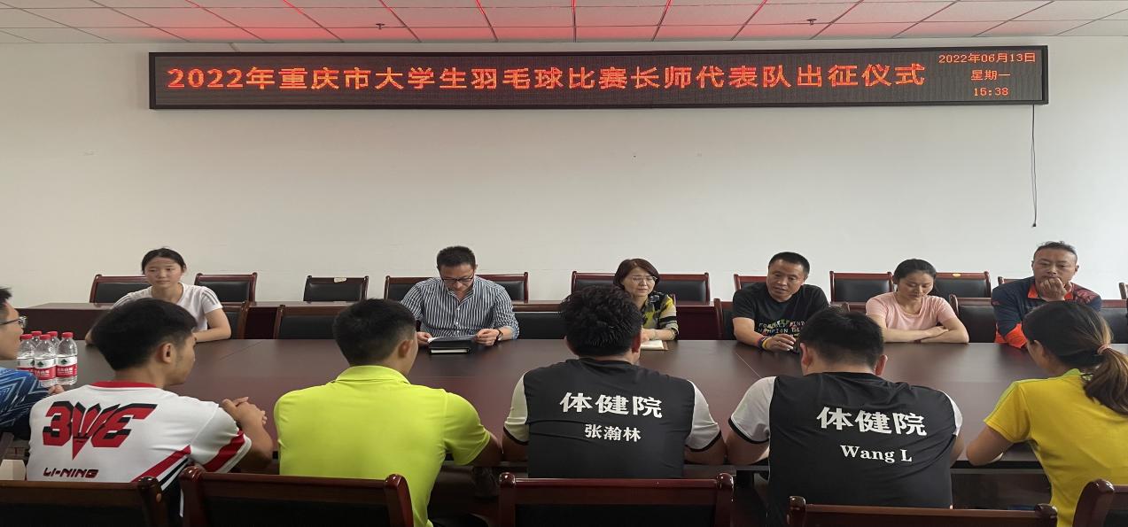 2022年6月13日下午15:30,2022年重庆市大学生羽毛球比赛长师代表队出征仪式在弘毅体育馆127会议室举行,体育与健康科学学院党总支书记何海燕、团委书记何明,教练员吴胜涛、袁锋、于菲及全体参赛队员出席本次出征仪式。
