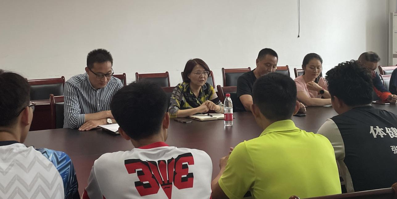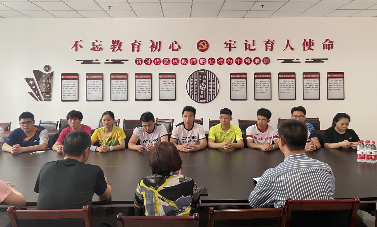 2022年6月13日下午15:30,2022年重庆市大学生羽毛球比赛长师代表队出征仪式在弘毅体育馆127会议室举行,体育与健康科学学院党总支书记何海燕、团委书记何明,教练员吴胜涛、袁锋、于菲及全体参赛队员出席本次出征仪式。