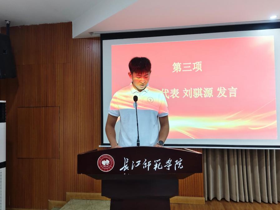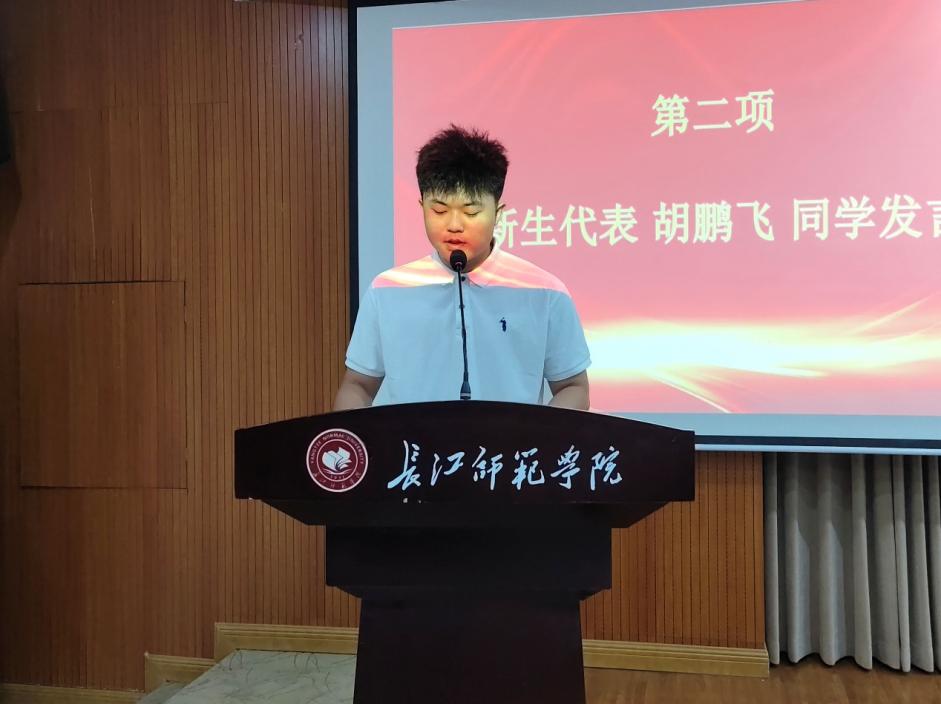新生代表胡鹏飞发言。他言辞恳切地表达了对老师、师兄师姐及志愿者们的感激,同时立下坚定志向:要在学院这片充满希望的土地上努力学习、追求全面发展,早日成为一名优秀的体育人,为学院争光添彩。