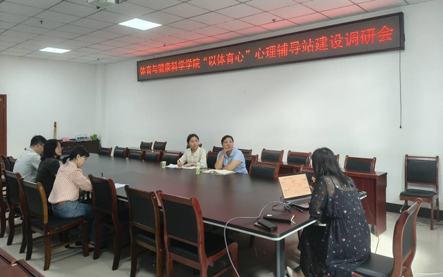 9月19日,学院院在弘毅体育馆127会议室召开“以体育心”心理辅导站建设研讨会,学校心理健康服务中心相关工作人员到学院调研二级心理辅导站建设,学院学工办主任彭甜媛及各年级辅导员参加会议。